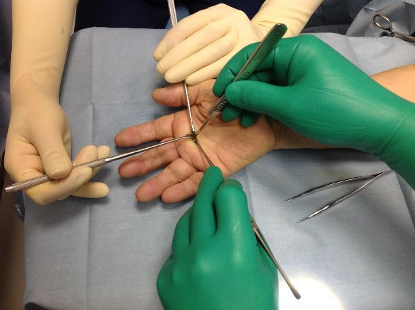 腱鞘炎は軽症であれば、8割は保存的管理(ステロイドの腱鞘内注入・安静)により治癒すると言われています。しかし、慢性化したり重症化すると、症状を改善するために手術が必要になります。手術は通常は局所麻酔下に行われ、腱鞘上の約1cmの皮膚切開から腱鞘を切り開きます。手術して切り開いた腱鞘は内腔が広がった状態で治癒しますから心配いりません。症状を改善させるために、同時に腱鞘内に増生した滑膜の切除や拘縮した関節の授動が必要になることがあります(ご注意:傷の小ささは、必ずしも良い結果と結びつきません。操作を安全に行い、最良の結果を得るために、必要十分な皮膚切開を行う必要があります)。