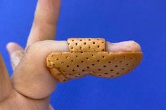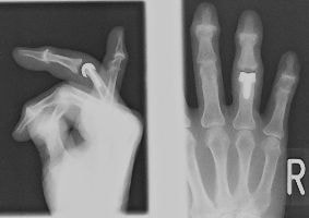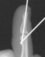 治療は、骨折があれば骨片の整復・固定を行うことで良好な結果が得られます。腱断裂の場合には2ヶ月間の外固定により4割の指に良好な結果が得られますが、6割の指には様々な程度(5〜20°)のDIP関節伸展障害が残存します。結果は、どれだけ早期に固定を開始できたか?と、どれだけしっかりとDIP関節の伸展位固定を維持できたか?にかかっており、ただ単に固定していたら治る、というものではありません。