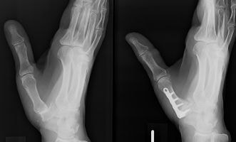 母指CM関節症に対する関節固定術(左)と関節形成術(右)