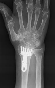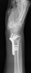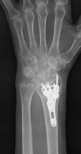 具体的には、前腕尺側の皮膚切開から尺骨を骨切して短縮し、プレートとスクリューを用いて固定します。しっかりと固定されれば早期から簡単な手の使用は可能ですが、手関節に負荷が掛かる動作・業務・スポーツは、3ヶ月ほど控えていただく必要があります。