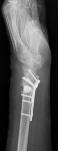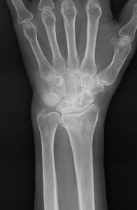 治療法は、骨折の型、骨折の徒手整復の可否、そして合併症の有無により異なり、比較的軽いものには保存的治療が、変形が大きかったり粉砕していたり骨折が関節内に及ぶ重症例には手術が行われてきました。しかしながら、近年は一人暮らしのご高齢の方の増加により、さほど重症でない骨折に対しても、早期から手の使用を可能とし、後遺障害を少なくするために手術を行うことが多くなってきています。